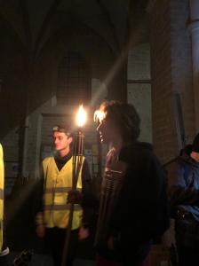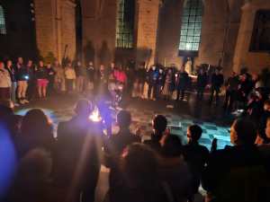 A St Médard, une centaine de personnes tenait à célébrer son entrée par un grand carré autour du feu au beau milieu de l’église. Père Alexandre a couru avec une équipe jusqu’à Louvain-la-neuve pour sa diffusion lors de la messe des étudiants de mercredi!