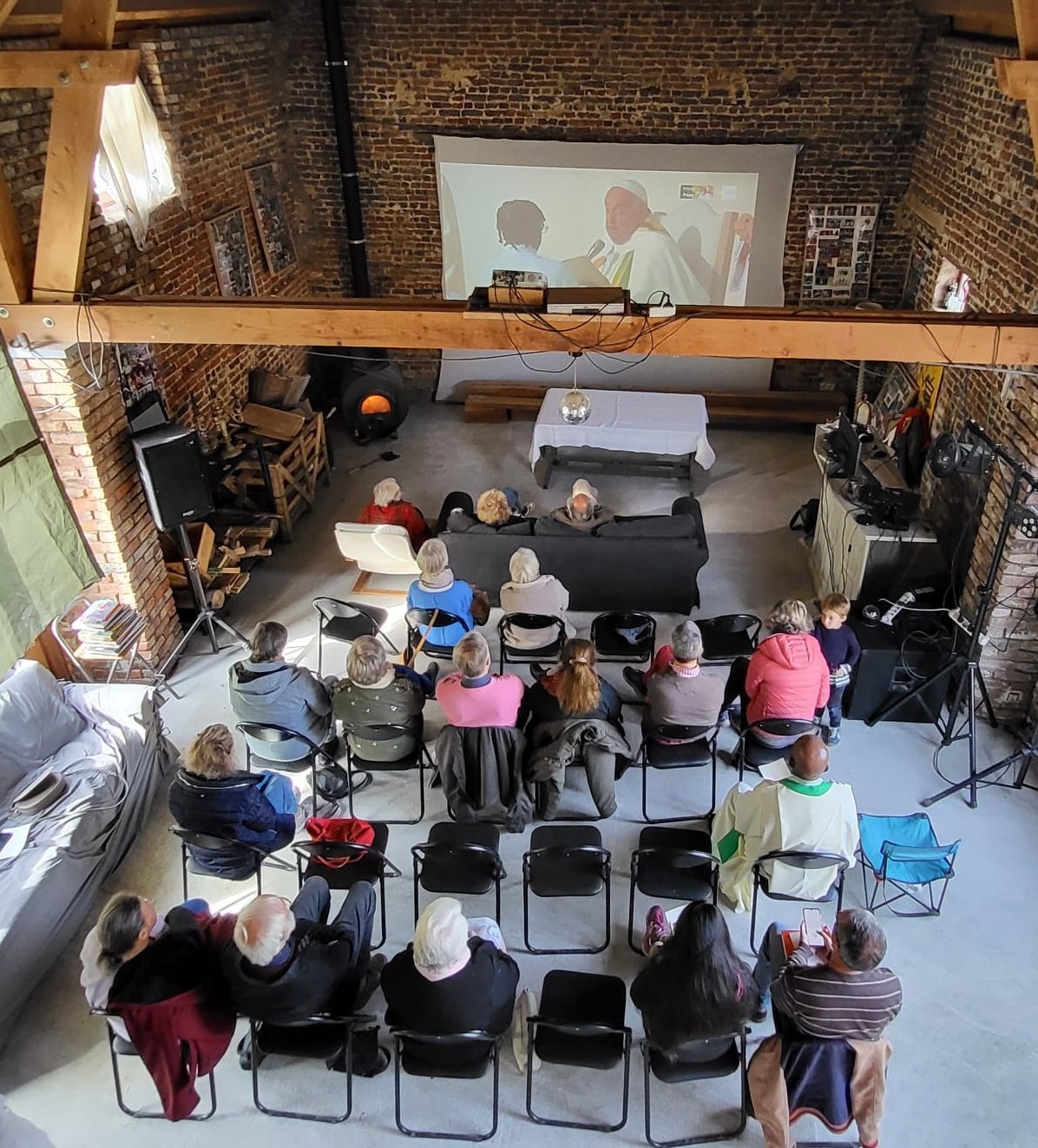 Plusieurs personnes se sont rassemblés pour vivre la messe papale projetée sur un grand écran. Moment de communion entre des paroissiens de différentes églises de notre commune. L’abbé Tchuma a distribué la communion. Un petit verre de l’amitié nous a été offert à l’issue de la messe.