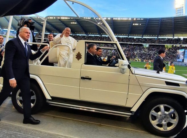 Joie présente en un frémissement et puis une explosion d’applaudissements et de drapeaux agités lors de l’ arrivée du Pape François au stade.Voici des mots du Saint Père dans ma mémoire :