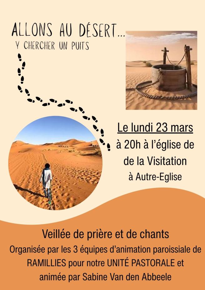 « Allons au désert, y chercher un puits… » Cette veillée de prière et de chants, organisée par les trois équipes paroissiales de Ramillies pour notre unité pastorale, nous invite à faire une halte au cœur du Carême pour nous recentrer sur l’essentiel et laisser la Parole de Dieu désaltérer notre soif intérieure.
