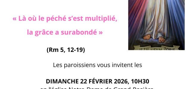 « Là où le péché s’est multiplié, la grâce a surabondé » (Rm 5, 12-19) Les paroissiens vous invitent les DIMANCHE 22 FÉVRIER 2026, 10H30 EN L’ÉGLISE NOTRE-DAME DE GRAND-ROSIÈRE, RUE D’ALBROUX 8 À GRAND-ROSIÈRE DIMANCHE 21 JUIN 2026, 10H30 EN L’ÉGLISE DE NOTRE-DAME DU ROSAIRE, RUE DE MONT-SAINT-ANDRÉ À BOMAL Célébrations suivies d’un apéritif festif où tous … Lire la suite Messe à l’Unisson trimestrielle du secteur Bomal, Gérompont, Gd-Rosière et MSA