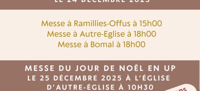 Nous vous invitons chaleureusement à vivre ensemble la joie de Noël lors des différentes célébrations organisées dans notre Unité Pastorale. ✨ Veillée de Noël – 24 décembre 2025 15h00 : Messe à Ramillies-Offus 18h00 : Messe à Autre-Église 18h00 : Messe à Bomal ✨ Jour de Noël – 25 décembre 2025 10h30 : Messe du … Lire la suite 🎄 Célébrations de Noël dans l’UP de Ramillies 🎄
