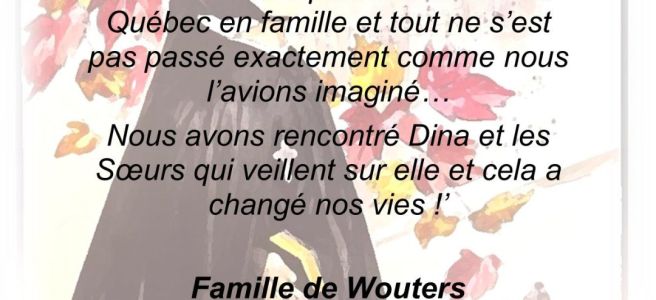 ‘Nous sommes partis deux ans au Québec en famille et tout ne s’est pas passé exactement comme nous l’avions imaginé… Nous avons rencontré Dina et les Sœurs qui veillent sur elle et cela a changé nos vies !’ Famille de Wouters 📅 22 mai 2026 – 20h00📍 Église de Mont‑Saint‑André